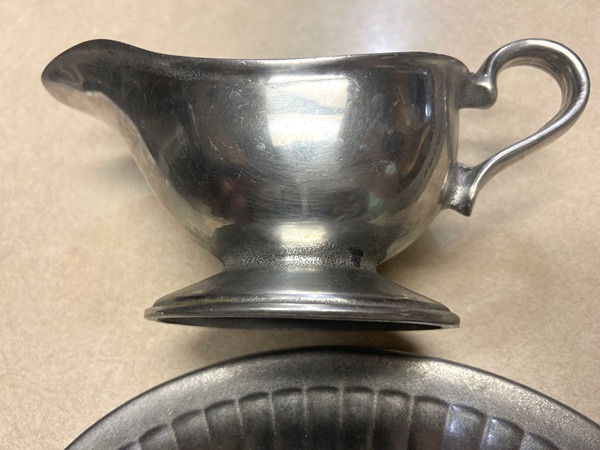 Wilton Armetale 2-Piece Gravy Boat & Underplate in Flutes & Pearls pattern. Wilton Armetale Serveware is an aluminum-based alloy, handcrafted, designed to last a lifetime, and should be hand washed. This set is in very good used condition from smoke free home. There's wear/usage, but it is structurally sound. Measures approx. 9 1/4 inches long. Great for upcoming holidays! $25