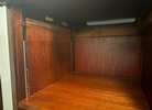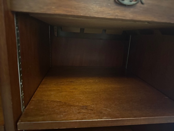 The electronics (turntable, tuner, and amp) seem to have been removed, as the compartments are empty in the photos—no visible changer base, speaker grilles, or wiring. Without chassis numbers (typically stamped on metal plates inside the back or bottom), exact model confirmation is tricky, but the logo and construction align with Magnavox’s pre-Astro-Sonic era pieces.