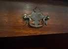 This is a vintage Magnavox console phonograph (record player) cabinet from the mid-1950s, manufactured in Fort Wayne, Indiana. Based on the traditional colonial-style design with raised panel doors, brass drop handles with acanthus leaf motifs, one upper drawer (likely for accessories like needles or cables), adjustable interior shelves behind the double doors (for record storage), and a hinged lift-top lid revealing an open compartment (originally for the turntable mechanism), it matches descriptions of early Magnavox high-fidelity models like those in their 1950s catalogs, such as the Regency Symphony or Belvedere series. These were solid wood cabinets (likely walnut veneer over hardwood) built to house tube-based AM/FM radios, amplifiers, and automatic record changers, emphasizing aesthetic integration into home decor.
