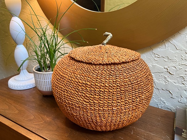 -Woven Pumpkin Basket. Decorative woven basket shaped like a pumpkin. Approx. 13” x 15”…$20 firm
