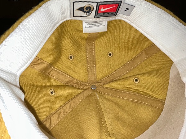 Gold fitted Nike hat, men's size 7, featuring the blue "R" logo outlined in white on the front and the NFL logo on the back. Made of wool. New with tags from smoke free home. $20