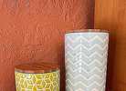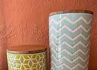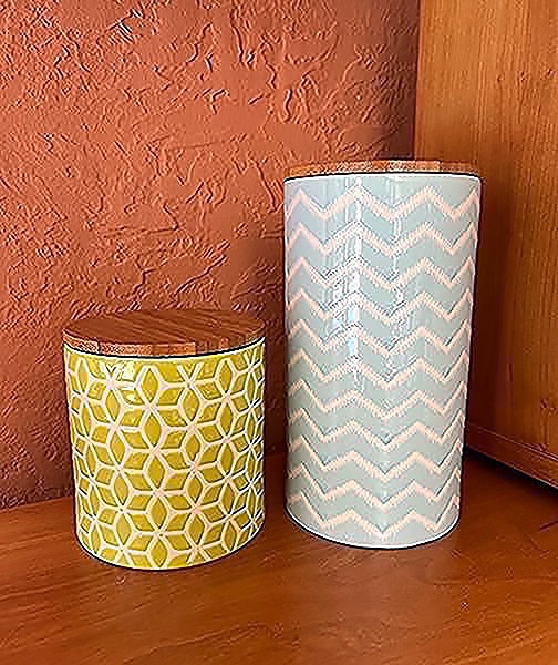 Green and blue geometric patterned ceramic canisters with bamboo lids