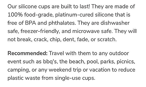 Silicone! Flexible, unbreakable glass set of 2. New! Travel with them to any outdoor event such as bbq's, the beach, pool, parks, picnics, camping, or any weekend trip or vacation to reduce plastic waste from single-use cups.