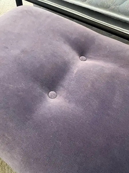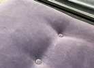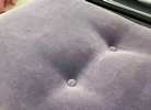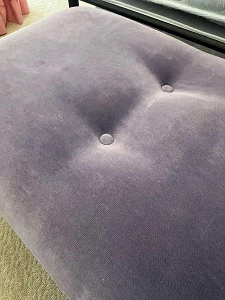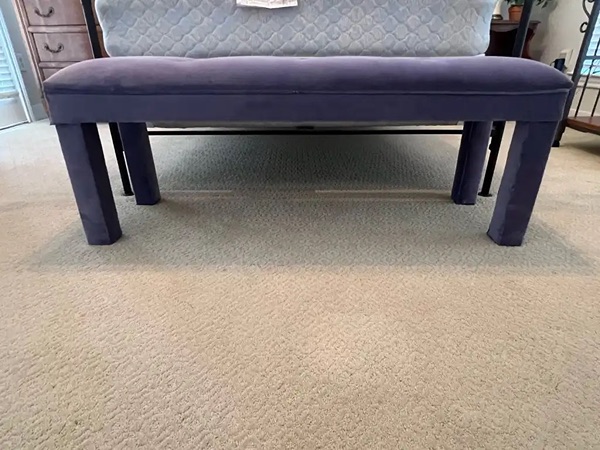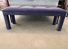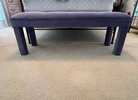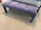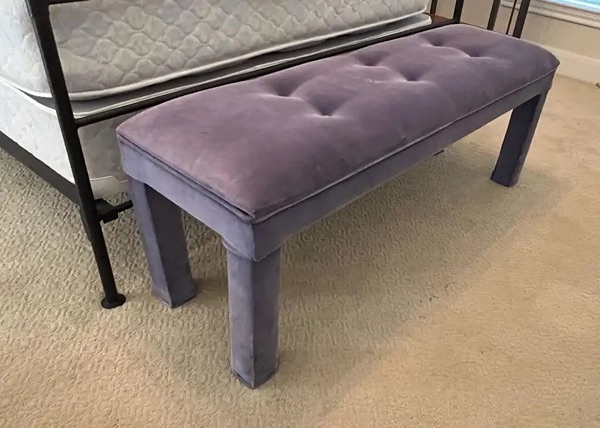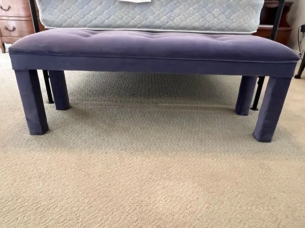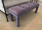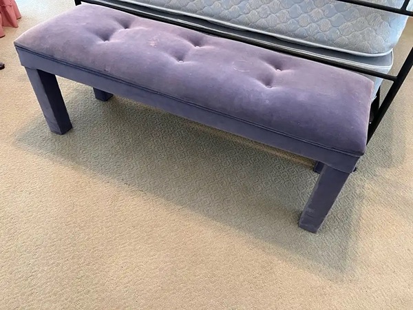 Velvet upholstered bench with tufted design. Blueish, lavender in color, couple stains. Could be reupholstered, if desired. Approx. 4 feet x 16” x 19” high. Pictures show it at the foot of a full-size bed (also for sale)…$45 firm