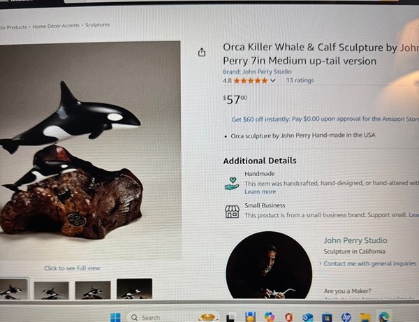 John Perry Decorative orca whale figures mounted on natural burlwood base *** Approximate size: Mother 6" ** Calf 3" ** Base 7" x 10" ** Height 7" *** Like new condition