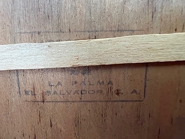 Hand painted wooden nativity scene. Leather hinges allow it to close and fold open. Popsicle stick affixed to back for wall hanging. Approx. 7 1/2” x 5”. Stamp reads “La Palma El Salvador…$20 firm