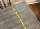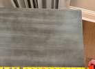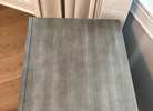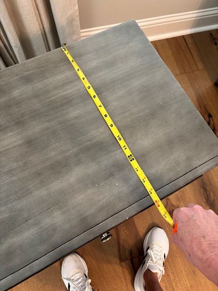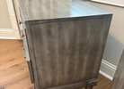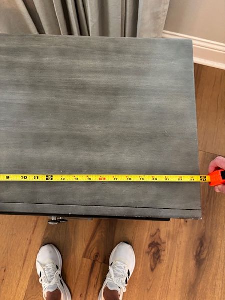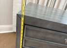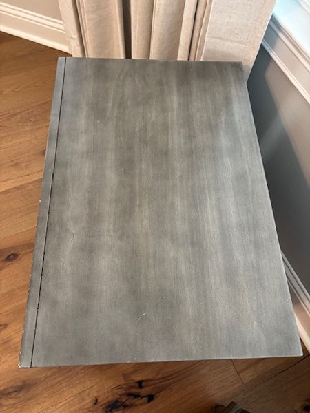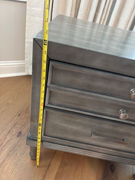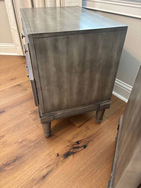 Two gray nightstands with 3 drawers. There is a hidden drawer that is narrower once you open the top drawer. Bottom drawer is deeper than other drawers. We cut small holes on the backsides of each to send an extension cord through for our phones. These both have pretty nice tops, but there are nicks and scratches on the sides. of both.