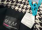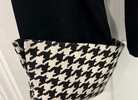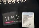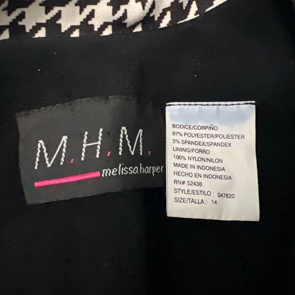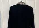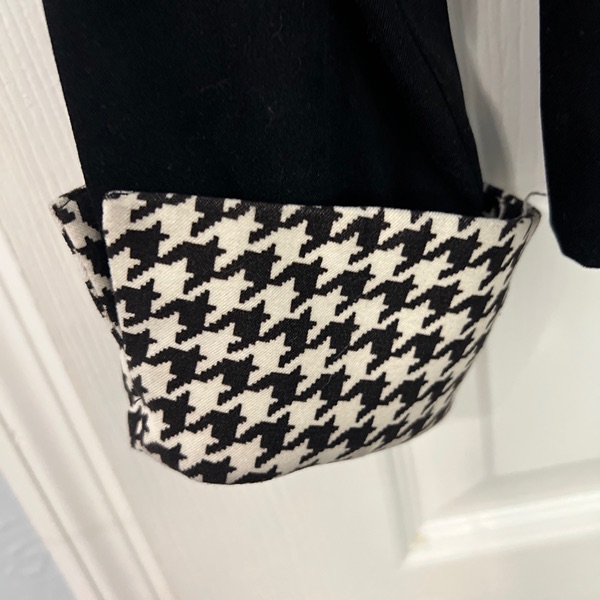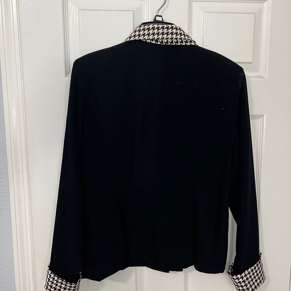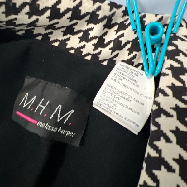 Melissa Harper vintage MHM Crush Velvet Black/ with a zigzag plaid white/black sleeve and collar. Long Sleeve Blazer Jacket Sz 14. Very light shoulder pads. Decorative silver and black 5 buttons. Jacket is just below waist length approximately 23”. Cuffs are turned up. Collar is 3” wide and pointy at ends. Very good condition!