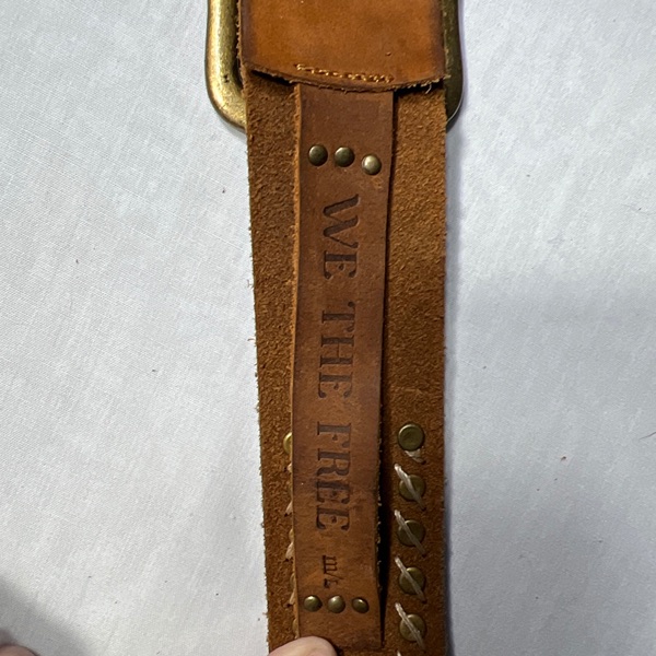 We The Free” Carmel Brown Suede brass Studded size M/L Brass Buckle Cowboy Western Belt. 47” with a 2 3/4” buckle. Excellent condition.