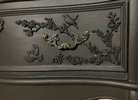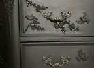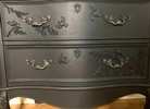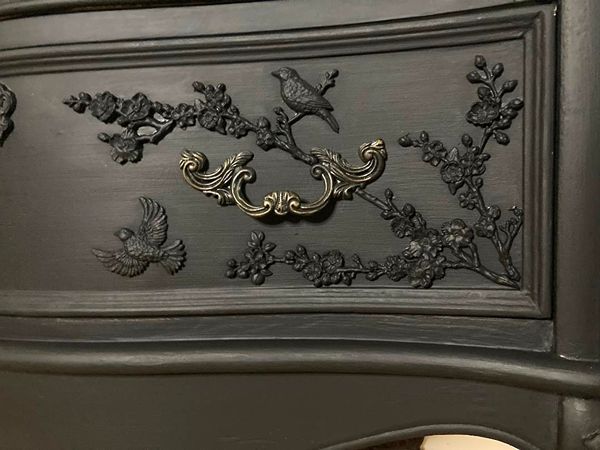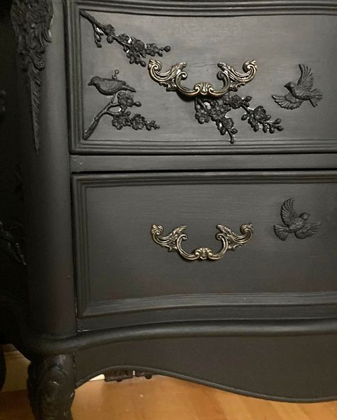 - Re-imagined, entry/buffet/coffee bar is ready for your home.- We cleaned, filled, sanded, primed, added flat velvety black paint in layers, hand poured and applied moulds of birds and branches and florals, then sealed in a flat poly for durability.- I created a luxurious velvety texture with a painting technique. It's hard to see it in pictures but it is a very luxurious feel and look in person.- The drawers are sturdy and glide smoothly in and out on their side rails with original hardware.- Solid and sturdy construction features sweeping lines and beautiful embellishments.- Color is a rich velvety black.