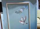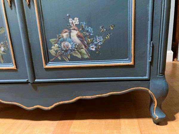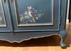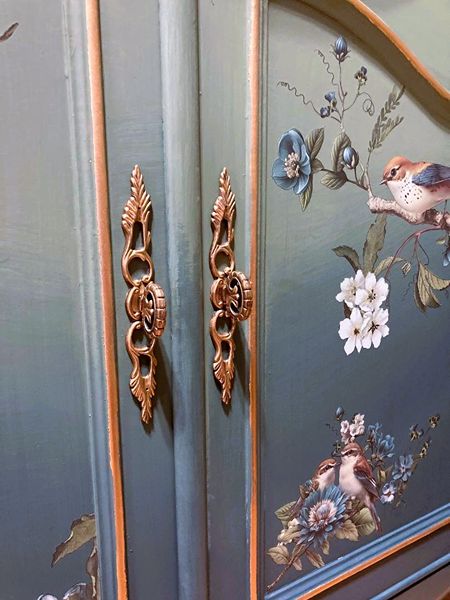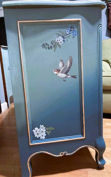 - We cleaned, filled, sanded, primed, painted in hombre shades of gray blues and gray greens. Then we added beautiful floral and birds transfer. Lastly, we gilded in gold and sealed with polyurethane for durability.