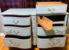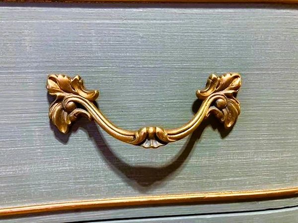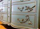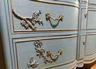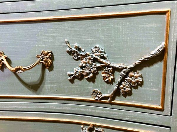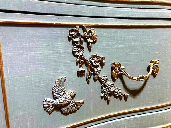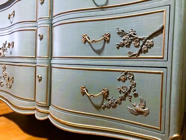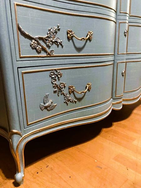 - We cleaned, filled, sanded, primed, added linen texture, painted in layers, I hand poured bird and branches molds, painted and gilded them then sealed the entire dresser for durability.