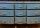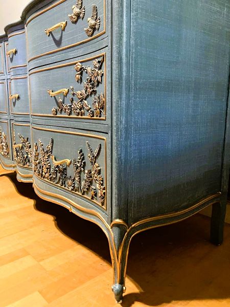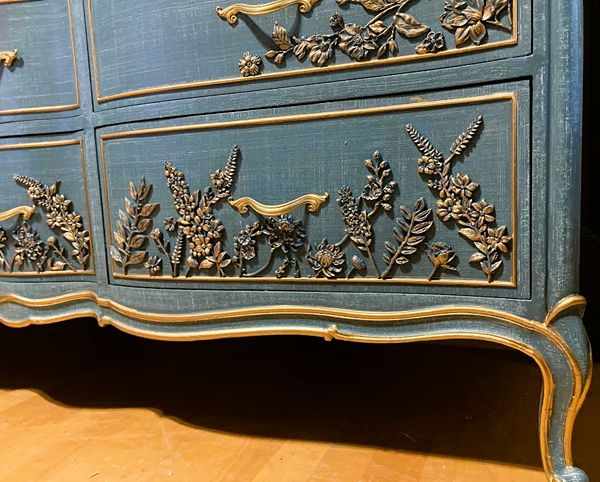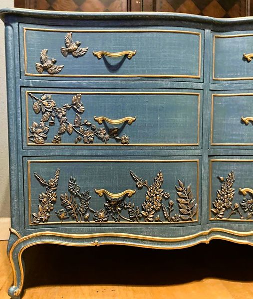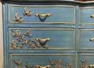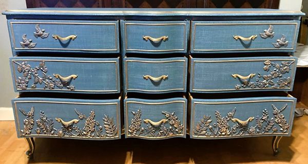 - Re-imagined, all wood, Drexel Touraine, French country, 9 Drawer Dresser is ready for your home.- We cleaned, filled, sanded, primed, added worn denim paint in layers, Hand poured moulds of florals and birds then attached, finally we gilded and sealed for durability.- I created the textured look of cozy worn denim with a painting technique. It's hard to see it in pictures but it is a very luxurious feel and look in person.- All drawers are sturdy, dove tailed and glide smoothly in and out on their center wood rails with original polished hardware.- Solid and sturdy wood construction of Drexel features sweeping lines and Drexel solid wood construction.- Color is a worn denim blue.- Dimensions: 36" Tall X 64" Wide X 22.5" Deep