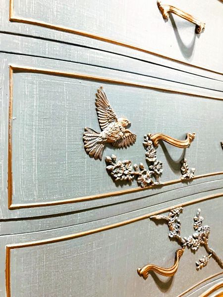 - Elegant vintage Drexel Touraine French country 9 Drawer Dresser ready for its new home.- We cleaned, filled, sanded, primed, added a cozy linen texture, applied hand poured moulds of birds and branches, then painted in layers, gilded and sealed for durability.- The drawers are sturdy, dove-tailed, glides smoothly in and out on its center metal rail with original hardware.- Solid and sturdy wood construction of the Drexel features elegant, sweeping lines and Drexel timeless style.- I created the texture and look of linen with a texture and painting technique exclusive to my pieces. It's hard to see and truly appreciate the luxurious feel and look, unless you see it in person.-The color is a timeless linen texture in Dixie Belle's Serenity.Dimensions for each: 35.5" Tall X 64.5" Wide X 22.5" DeepPLEASE TEXT- Located near The Woodlands. Up to a 30 day hold with deposit. Delivery available for a fee.* Care Instructions: This Piece Needs 30 Days to Fully Cure. In those 30 days, Be Gentle. Cleaning: use a Damp Rag with Small Amount of Dish Soap if Needed. Once Cured, Clean as You Normally Would Your High-End Pieces.