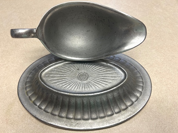 Wilton Armetale 2-Piece Gravy Boat & Underplate in Flutes & Pearls pattern. Wilton Armetale Serveware is an aluminum-based alloy, handcrafted, designed to last a lifetime, and should be hand washed. This set is in very good used condition from smoke free home. There's wear/usage, but it is structurally sound. Measures approx. 9 1/4 inches long. Great for upcoming holidays! $25