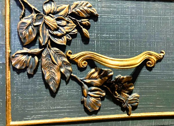 - We cleaned, filled, sanded, primed, added worn denim texture, applied hand poured moulds of birds and branches then painted in layers, gilded and sealed for durability.