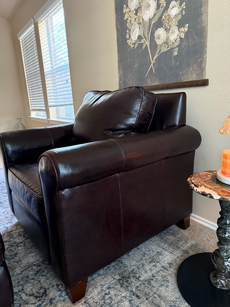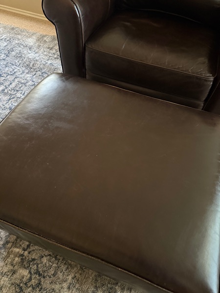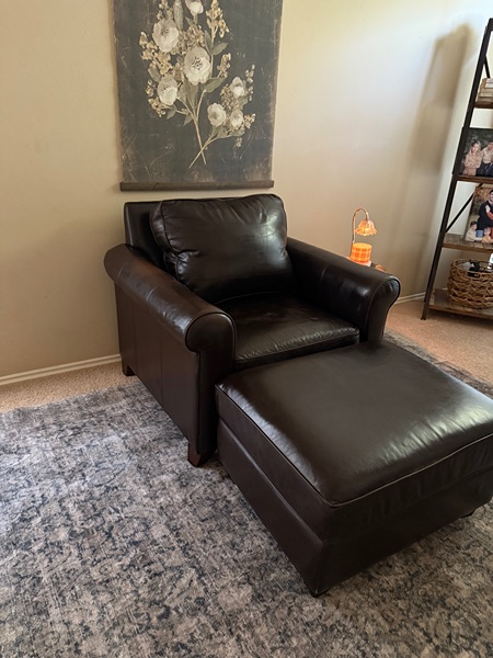 Beautiful Brown Real leather Chair from PB. Minor wear, small cuffs on the back side (see pic). Overall it’s in great condition.