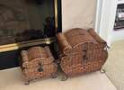 Two wicker baskets with decorative metal accents, perfect for storage or decor.
