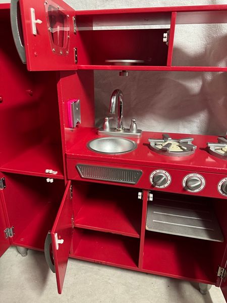 34" H x 32.5" W x 12" D *** Oven, cabinet, freezer, refrigerator and microwave doors open and close ** Working knobs on oven and sink ** Convenient storage above and below the sink ** Made of wood for long-lasting play ** See-through doors on oven and microwave ** Removable sink for easy cleanup