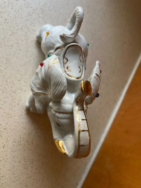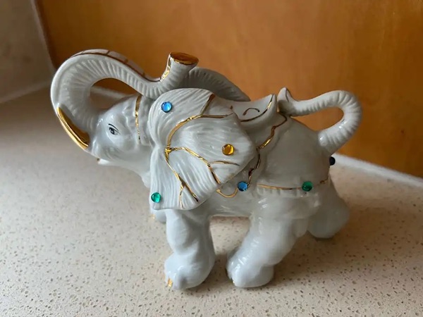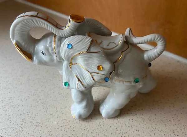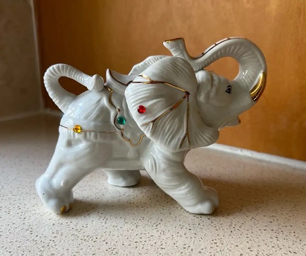 The figurine is a vintage white porcelain elephant adorned with jewels and gold trim. The elephant's trunk is raised, which in many cultures, including Feng Shui and Vastu, is considered a symbol of good luck, prosperity, and success.