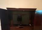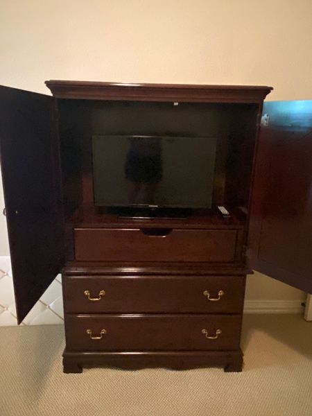 Armoire - Crawford of Jamestown - this unique and transitional furniture piece accommodates a TV unit and additional media accessories. Two large drawers below the upper door are great for storing clothing or other personal items. $300 if sold separately