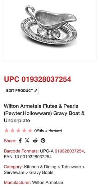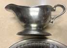 Wilton Armetale 2-Piece Gravy Boat & Underplate in Flutes & Pearls pattern. Wilton Armetale Serveware is an aluminum-based alloy, handcrafted, designed to last a lifetime, and should be hand washed. This set is in very good used condition from smoke free home. There's wear/usage, but it is structurally sound. Measures approx. 9 1/4 inches long. Great for upcoming holidays! $25