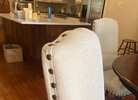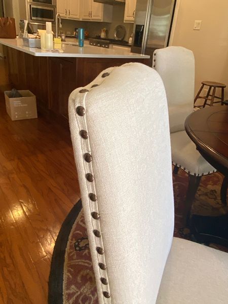 These classic French-style dining chairs are made of kiln-dried solid ash and a hardwood frame to prevent warping, splitting, cracking and mildew. Solid wood legs are hand-finished in a walnut stain. Deeply cushioned with foam fill, upholstered in an oatmeal linen blend upholstery, and trimmed with antique nail-head accents that trim the chair back and seat. $800 if purchased separately.