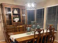This set includes a hutch, table, 2 leaves, 2 host chairs, and 4 guest chairs made of solid wood.