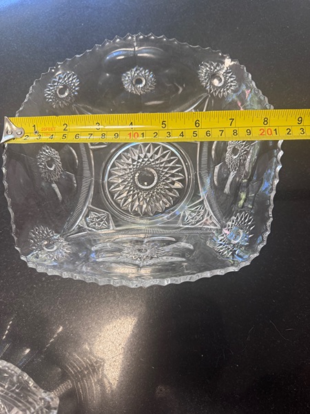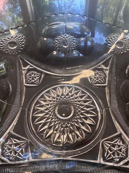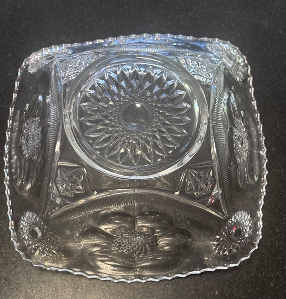 • Mark: “PRES CUT” (visible on the base), which stands for “Pressed to Imitate Cut”. This is a common early 20th-century marketing term used by multiple U.S. glassmakers (not a specific brand) to describe affordable molded glass mimicking expensive hand-cut crystal.