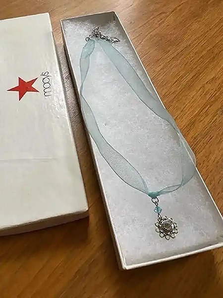 Delicate blue ribbon with dangling rhinestone...$5 firm