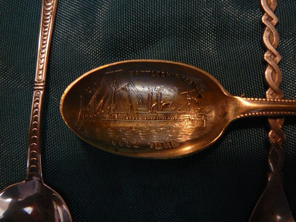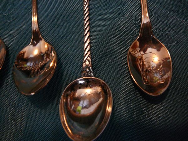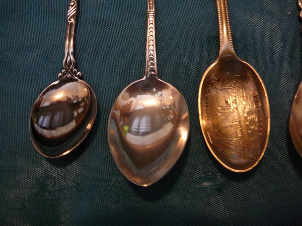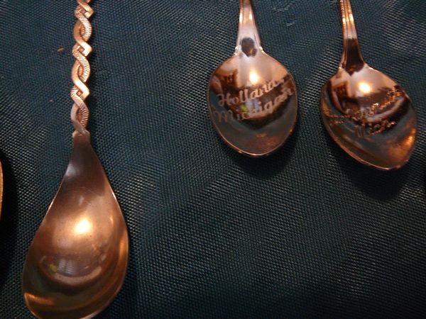 8 silver plate souvenir spoons ..... San Sebastian Spain blue enameled spoon ....Wiesbaden Germany enameled spoon ...U.S. Battleship Maine Captain Sigsbee .... Keukenhof Netherlands spoon ... Holland Michigan ....Frankenmuth Michigan .....Lausanne Switzerland ......Michigan ............$5 each or $35 for all