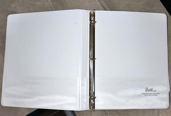 Clear overlay for customization on all three sides. PVC-free, non-stick material will not damage contents. Clear pockets on the inside front and back covers are ideal for storing loose documents. Back mounted round rings provide a cleaner look. Holds 8 - 1/2" x 11" sheets. 125 sheet capacity. Three total in very good condition from smoke-free home. Style 72205WE. $5/all