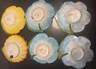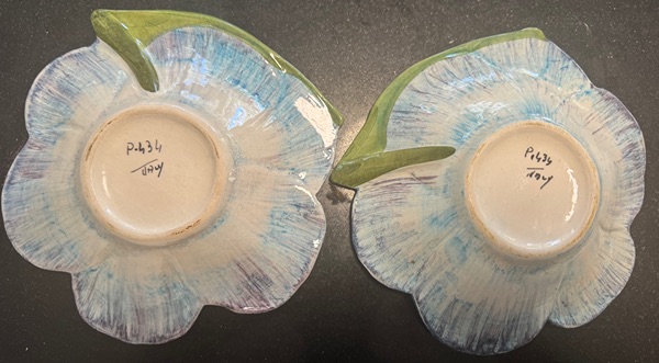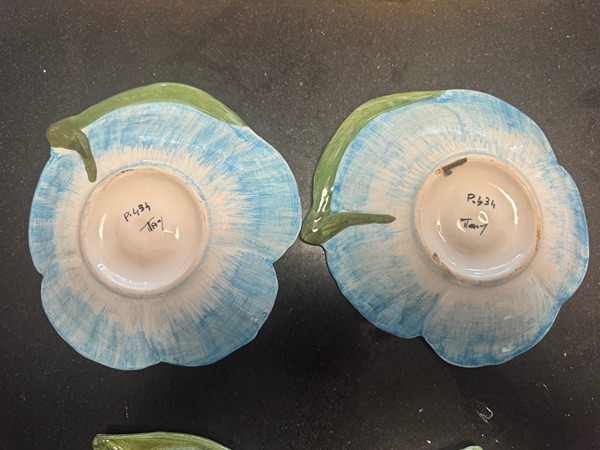These are a set of 12 vintage Italian hand-painted ceramic decorative saucers (or small shallow plates) in the majolica/faience style, molded and shaped like stylized flowers with attached leaf “handles” for a whimsical, organic look. Each features a different floral motif—such as sunflowers (yellow with textured centers), daisies or simple blooms (yellow or white), pansies or irises (blue or purple with darker veins and accents), and more abstract petal designs (pink or lavender)—all glazed in bright, glossy colors over earthenware. They date to the mid-20th century (likely 1950s–1970s) and originate from the Campania region of Italy, a historic center for such pottery (possibly near Vietri sul Mare, known for similar whimsical “Water Garden”-inspired patterns). The “P.” markings on the undersides (e.g., P.434, P.437, P.436) refer to pattern or mold numbers, with “Italy” confirming the origin; no specific artist or factory name is visible, but this is common for mass-produced decorative export ware from the era.