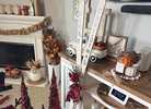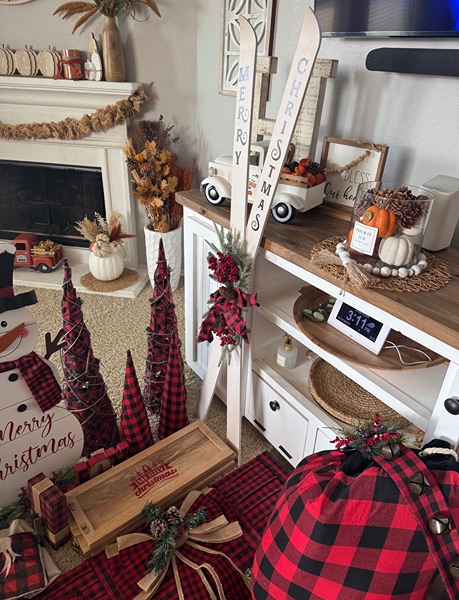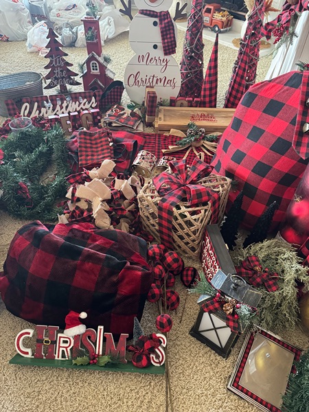 Includes: kitchen decor, wreaths for cabinets and banister, garland, ornaments (buffalo, black, and red), tree decorative ribbons, lots of signs, candle holders, towels, blanket, lantern, gift bags, tree skirt wooden box design, tree decor, Santa bag, bells, wrapping paper, picture frame, Christmas skis and other items!