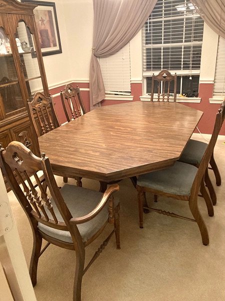 This set includes a hutch, table, 2 leaves, 2 host chairs, and 4 guest chairs made of solid wood.