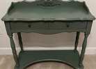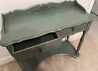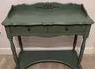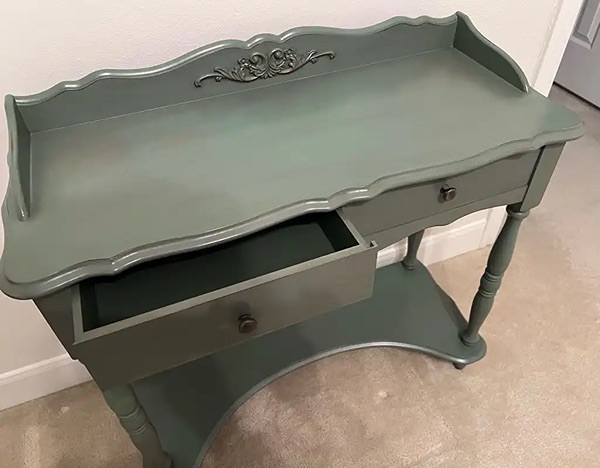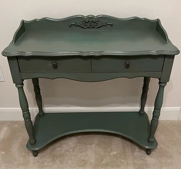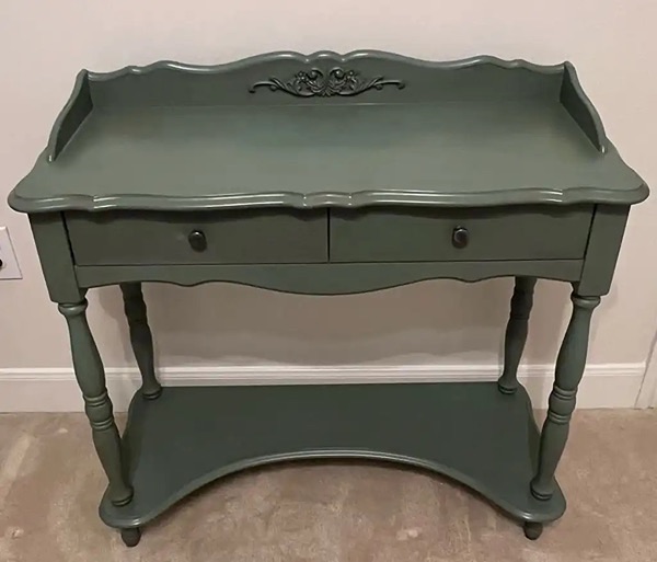 Elegant sage green wooden console entry table with two drawers and decorative details. Was in a spare room and never used…$100 firm