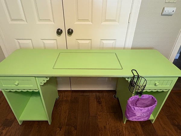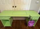 Sewing desk, Arrow “Olivia”, adorable vintage-look gingerbread design. 64” long x 24” deep. Features a 2-position mechanism that will support a 45lb machine and easily move your sewing machine into the flatbed and free-arm position. Pull the quick release lever forward to make the sewing platform flush with the top of the cabinet and use as a desk or hobby table. Two drawers and 2 deep cubbies for additional storage. Very good condition, except where I had a cup holder/thread basket, which comes with the desk! $200. 281/948-1692