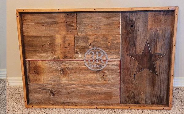 Wood Texas flag made with reclaimed cedar. 21' × 31' × 2' (dimensions are approximate). Sealed with exterior polyurethane. Every flag is unique. Color tones and wood textures will vary slightly from flag to flag. Custom sizes available. 3R Woodcrafts 832-746-l8O6 Text only please