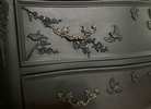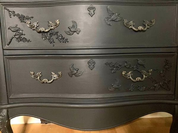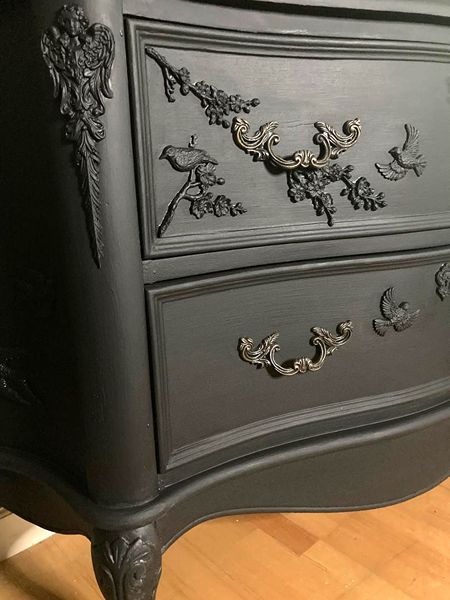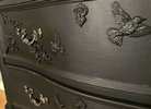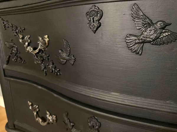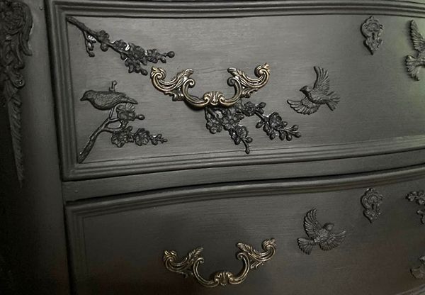 - We cleaned, filled, sanded, primed, added flat velvety black paint in layers, hand poured and applied moulds of birds and branches and florals, then sealed in a flat poly for durability.
