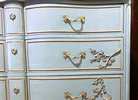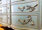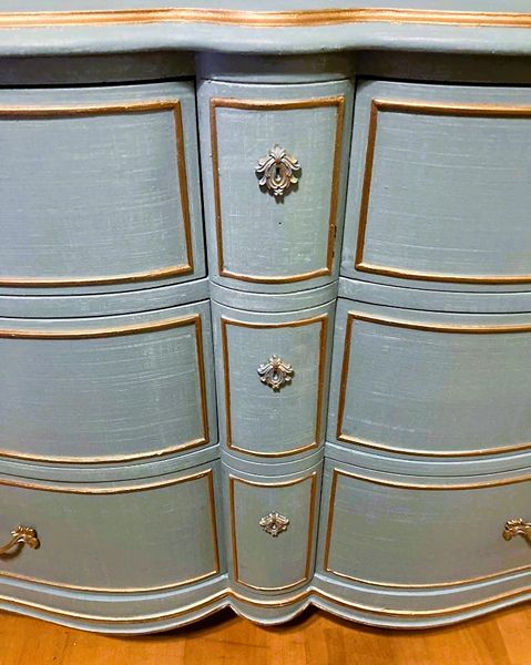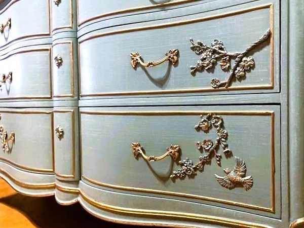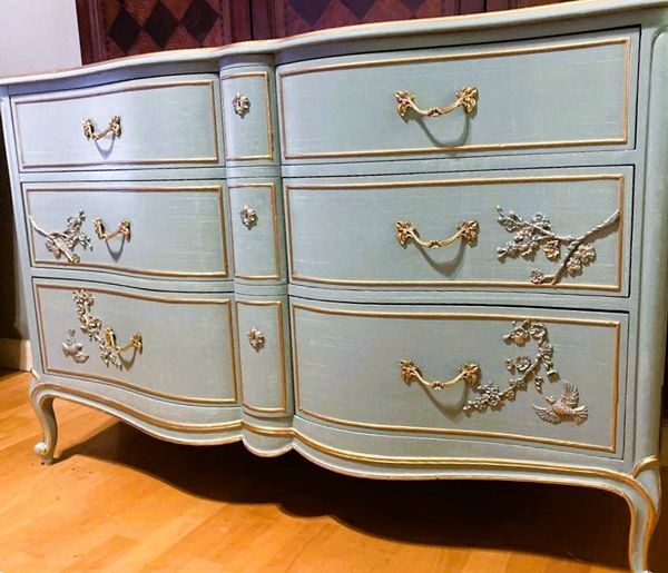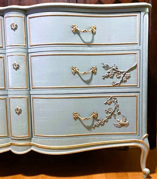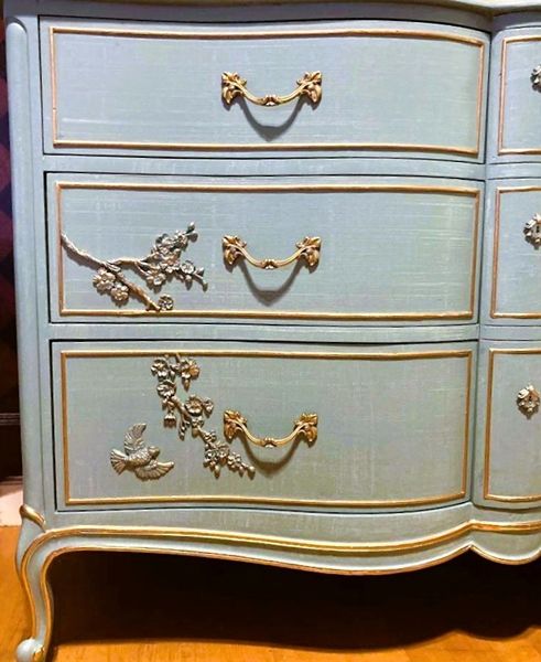 - We cleaned, filled, sanded, primed, added linen texture, painted in layers, I hand poured bird and branches molds, painted and gilded them then sealed the entire dresser for durability.