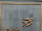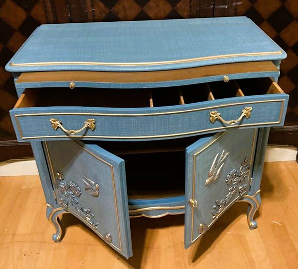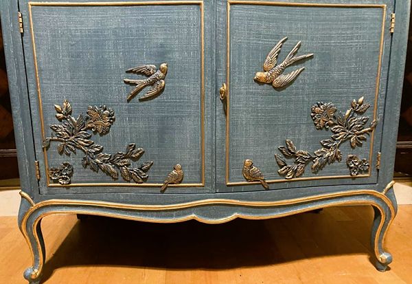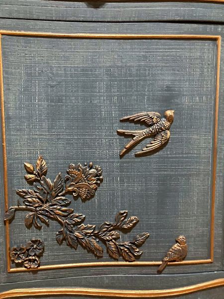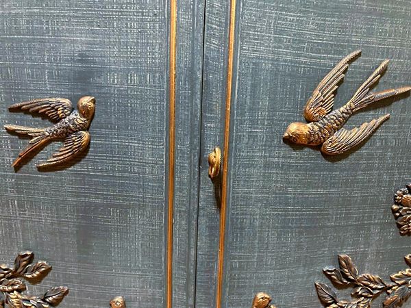 - We cleaned, filled, sanded, primed, added worn denim texture, applied hand poured moulds of birds and branches, then painted in layers, gilded and sealed for durability.