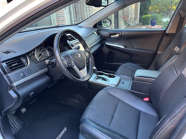 2013 Toyota Camry SE for sale. In great condition, must see to appreciate. White exterior, black interior, spoiler, front wheel drive, 17" alloy wheels and all standard quipment is functional. New tires, brake pads and rotors. Mileage 153,548. The Woodlands. Garaged.