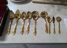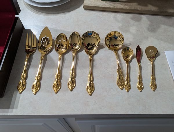 Twelve piece place setting plus Eight Seafood Forks,Six Long Ice Tea Spoons and Nine Serving Pieces,Wooden Storage Chest for Storage.Gold Electroplated no tarnish.Hand Wash . Maybe have used few times