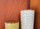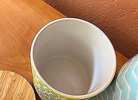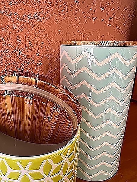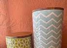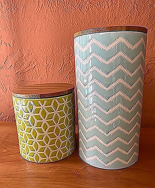 Green and blue geometric patterned ceramic canisters with bamboo lids