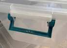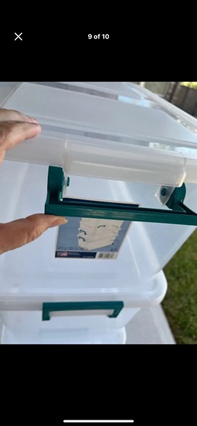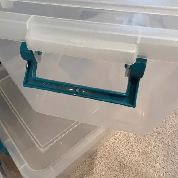 5-51 qt, 24 3/8" L X 15 1/8" W x 11 3/4" H. Durable plastic bins by Sterlite with turq. Snap on handles. Very good condition.