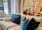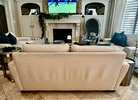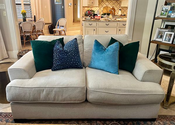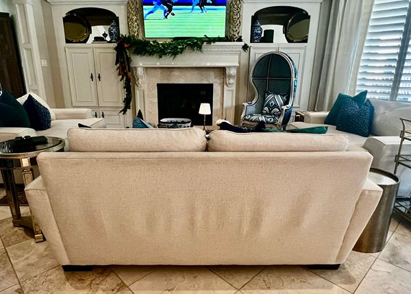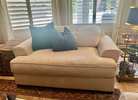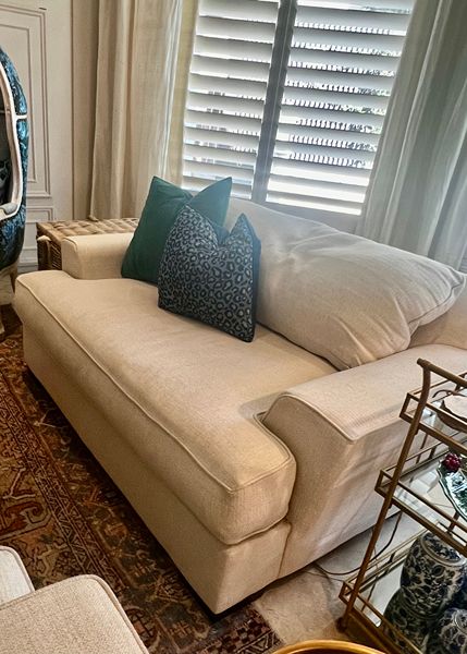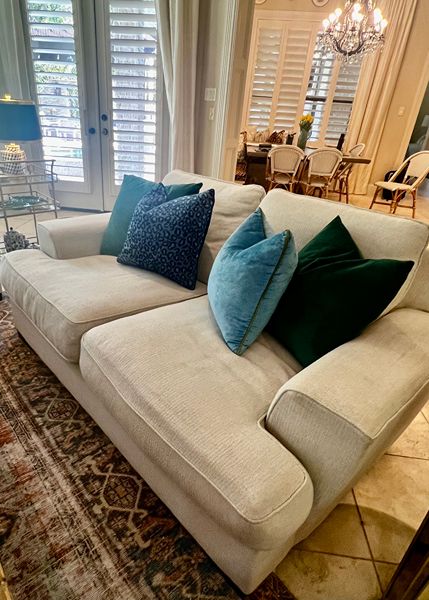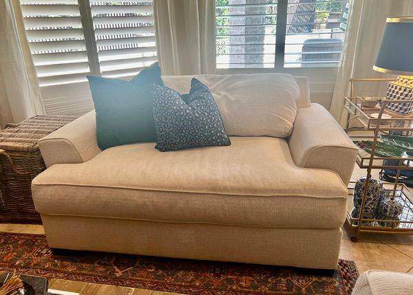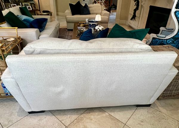 One couch and two matching love seats sold as a set of three for $600. Creamy white woven cotton fabric. Purchased at Macy's Furniture. They have moderate wear but lots of life left. No major stains. Steam cleaned in October 2025. For pick up only. Available on/after December 15. Green/blue throw pillows not included.