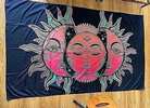 Colorful sun and moon design on black fabric. Blacklight reactive. Measures approx. 73” x 44”…$15 firm