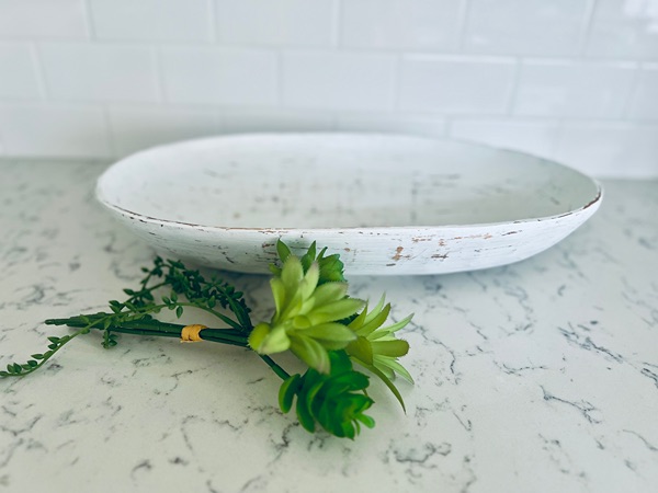 Lovely set of neutral home decor - includes succulent stems, vase, and distressed wood bowl. $15 for all, porch pickup in The Woodlands.