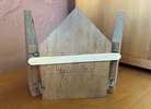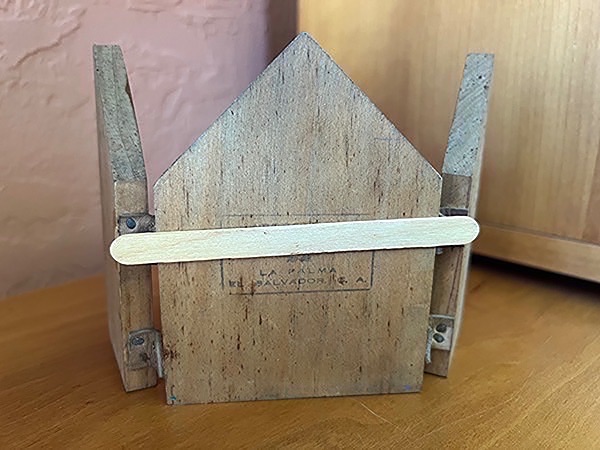 Hand painted wooden nativity scene. Leather hinges allow it to close and fold open. Popsicle stick affixed to back for wall hanging. Approx. 7 1/2” x 5”. Stamp reads “La Palma El Salvador…$20 firm