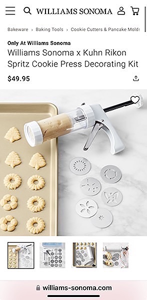 Quickly create spritz cookies or savory canapés in charming shapes for the holidays and beyond. Just fill the barrel of our press with dough and insert one of the discs. (Similar item shown in last pic.)…$25 firm
